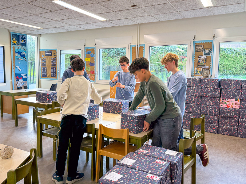 On Tuesday afternoon, our Year 3 and 4 students completed the final 36 boxes, and their Secondary peers jumped in to help with wrapping, tying the strings and carrying everything downstairs.
