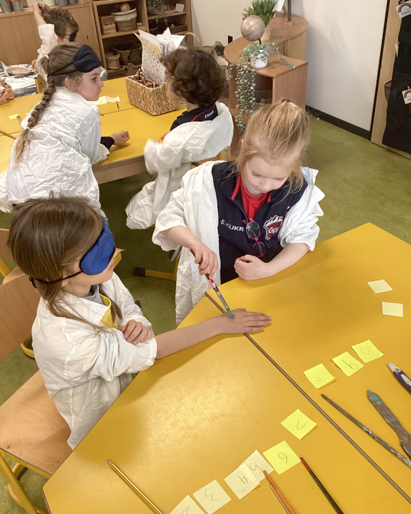 Working in pairs, they blindfolded their partner and used a variety of different-sized paintbrushes to test whether they could feel the touch on different parts of their body. They discovered that the back of the neck is one of the most sensitive areas and that everyone experiences touch differently, with varying levels of sensitivity. They then put their sense of smell to the test by sniffing a range of mystery scents hidden in cups to guess what they might be. After revealing the answers, they learned that the sense of smell also varies from person to person.