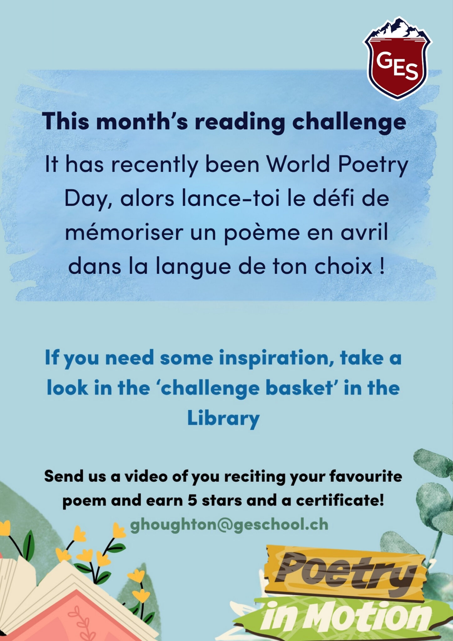 Participants can send a video of themselves reciting their chosen poem to Ms Houghton ([email protected]) and earn both a certificate and 5 precious stars for their House.